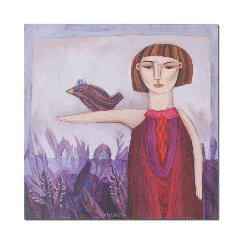 La obra de Constanza Villalba se caracteriza por su profundo enfoque en el arquetipo femenino. Sus personajes, mujeres cuidadosamente representadas, ocupan el centro de escenarios enigmáticos, los cuales están meticulosamente enmarcados por elaboradas viñetas. En estas escenas, Villalba logra crear una atmósfera mágica y cautivadora, donde la vida vegetal, aves y otros elementos de la naturaleza parecen adquirir vida propia.