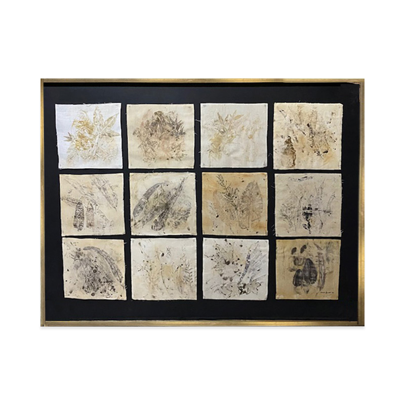 Maite Izquierdo, Políptico de sudarios naturales, Eco Print sobre seda, 87 x 104 cm.